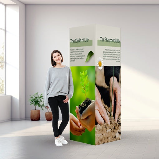 The textile totem weighs 15 kg and measures 100 × 100 × 228 cm (W × D × H) when assembled. The packaging has compact dimensions of 37 × 37 × 80 cm .