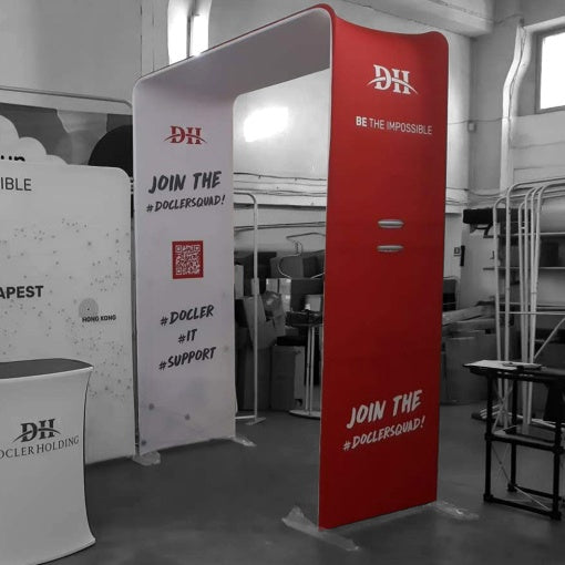 The Click system is an innovative display system consisting of a lightweight aluminum inner structure covered with fire-resistant, high-resolution printed fabric.